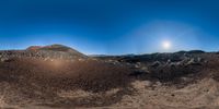 there is a large field full of dirt and rocks with the sun rising over a mountainside
