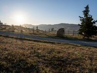 A picturesque rural landscape in Tuscany, Italy. The rugged road meanders through the countryside, bathed in the warm glow of the rising sun. Clear skies and the lush greenery of the garden complete the idyllic scene.