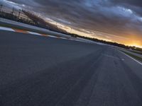 A dramatic sunrise over the mountains of Valencia, Spain. The straight road stretches into the horizon, lined with trees. The asphalt race track glistens with the morning light, creating a dramatic atmosphere. A perfect setting for racing.
