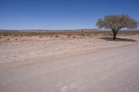 This is an image of an endless road in the South African desert. The landscape is characterized by vast plains, scattered trees, and sparse vegetation. The clear sky above creates a backdrop for the horizon, giving the scene an endless quality. The road surface, covered in dirt and gravel, creates a sense of motion blur. This photo represents the untouched beauty of the African landscape, with its tints and shades creating a mesmerizing effect.