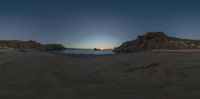 A stunning sunset on a Portuguese beach, with rocky formations in the foreground. The clear sky and calm ocean create a serene atmosphere. The panoramic view captures the beauty of the coastal landscape.