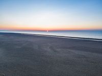 A lone person walks along an empty beach towards the water at sunset on a bright sunny day. The clear sky and open space of the Dutch coastline creates a picturesque view of the horizon.