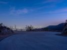 Skateboarder riding the ramp at sunset in California. Rocky hill and mountain provide a scenic backdrop. Cityscape in the distance contrasts with the open space and nature. Perfect for recreational activities.