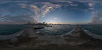 a sunset in chicago from across the water with buildings in the background and the sun setting on the horizon