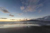 a lone bird is sitting on the beach at sunsettime with the clouds reflected in the wet sand