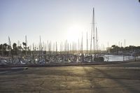 there are many sailboats and sail boats on the water in this harbor at sunset