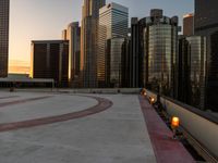 A stunning view of the Los Angeles cityscape at sunset, showcasing futuristic architecture and modern office buildings. The open space design and concrete surfaces create a sleek urban atmosphere. The helipad on a rooftop adds a touch of sophistication to this bustling business district.