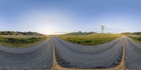 A scenic view of a three-lane asphalt road in California at sunset. Two windmills can be seen in the distance, with grass covering the ground and mountains in the background. The perfect blend of nature and infrastructure in the natural environment of California.