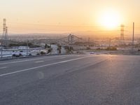 This captivating stock photo captures the beauty of Los Angeles at dusk. The sun sets behind a road that stretches into a rural valley, with numerous buildings dotting the landscape. The image showcases the city's unique blend of urban and natural elements. The asphalt road cuts through the residential and suburban areas, showcasing the city's infrastructure. The winter evening sky is adorned with clouds, enhancing the picturesque horizon. The image also features overhead power lines, highlighting the industrial nature of the region. The sun, visible in the frame, provides a warm and sunny atmosphere. Perfect for illustrating themes related to city life, suburban living, and the beauty of evenings.