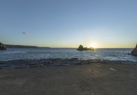 This stunning stock photo captures the beautiful sunset over a rocky beach in Portugal. The sun is setting on the horizon, creating a mesmerizing afterglow that lights up the clear sky. The coastal landscape offers a breathtaking view of the ocean, with calm waters gently lapping against the shore. The rocky surface adds an element of tranquility to the scene, making it the perfect image to represent the beauty of nature and open spaces. The warm sunlight and sunny weather make this a truly idyllic setting for a beach getaway. Whether you need an image for water resources, beach, landscape, or simply to evoke a sense of serenity, this photo is sure to meet your needs.