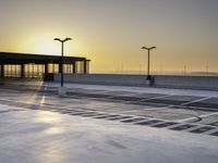 there is an empty parking lot in front of a building at sunset on the seawall