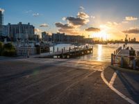 This stunning stock photo shows a pier with boats on water during sunset time in Miami, Florida. The cityscape area of Miami Beach is visible in the background, creating a beautiful coastal landscape. The sun is visible on the water's surface, making the scene even more captivating. The photo captures the urban design and natural beauty of this coastal city, showcasing its vibrant atmosphere. This image is perfect for illustrating the sunny and relaxing vibes of Miami, USA.