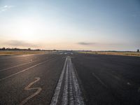 A breathtaking sunset at an airport in Berlin, Germany. The sun is setting on a runway with a dotted path going to the left. The clear sky is painted with vibrant hues of orange and yellow, creating a stunning landscape. The asphalt road surface glistens under the sunlight, leading straight down the road into the horizon. This urban airfield provides an open space amidst the city life, where the sun is visible, casting a warm and sunny atmosphere. Discover the beauty of urban design and the charm of Berlin's airport at sunset.