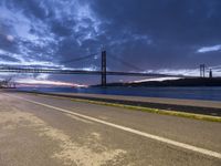 This stock photo features a breathtaking view across the highway of a large bridge, a large body of water, and a long bridge at sunset. The sky above is filled with beautiful clouds, creating a stunning backdrop. The road surface, made of asphalt, stretches out into the distance, leading the viewer's gaze towards the bridge. The scene is illuminated by the soft glow of the setting sun, casting a warm light on the entire landscape. The photo captures the peacefulness of the moment, with electricity lines running alongside the thoroughfare. The location of this captivating shot is Lisbon, Portugal, in Europe's coastal region. The image showcases the natural beauty of the area, with the ocean stretching out beyond the bridge. The curvature of the bridge and the underpass add an interesting architectural element to the composition. This high-quality stock photo is perfect for any project related to travel, nature, road journeys, or urban exploration.