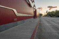 This stock photo captures the beauty of Los Angeles, California at sunset. The image shows a street with a red building near it, and a stunning sunset behind it. The street is near the curb of an empty road, illuminated by the warm glow of the setting sun. The modern architecture of the red building can be seen, showcasing the urban landscape of the city. The clear sky adds a touch of serenity to the scene. The straight road, made of concrete and asphalt, leads the viewer's gaze straight down the road, highlighting the city's infrastructure. This image is perfect for projects related to architecture, urban life, and travel in California, USA.