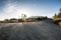 A scenic view of a road with gravel and bushes in the foreground, curving through a mountainous landscape. The sun casts a warm glow on the asphalt surface, creating a beautiful contrast against the clear sky. In the distance, contrails streak across the sky, adding to the overall picturesque scene. This sunny day provides an emotional and uplifting overview of nature's beauty.