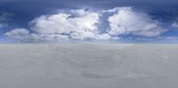 Sun shines over vast salt flats, creating an endless desert landscape. Clouds dot the open skies, adding contrast. A serene sunny day unveils the natural beauty of salt lakes and expansive spaces.