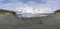 a surreal view of a beach with rocks and ocean below with sun shining through the clouds
