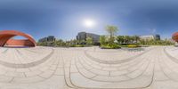 A modern architectural masterpiece in Suzhou, China. The building's facade is a stunning combination of concrete, glass, and metal. The park features a peaceful atmosphere, with a bench for relaxation. A perfect vacation spot.