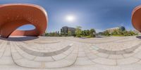 a 360 - view of three circular chairs in a park near a building, each sitting on an adjacent wall