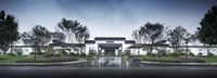 A majestic suburban mansion in Suzhou, China. The exterior showcases a tall and elegant structure, illuminated by artificial light against a clear sky. This impressive property is a symbol of luxury and fine architecture.