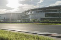 A sunny day in Suzhou, China, showcasing modern architecture in a bustling city. The sunlight reflects off the race track, creating a vibrant atmosphere. Residential areas surrounded by lush green grass add to the picturesque landscape.