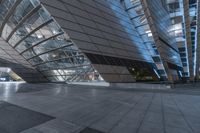 A modern architecture structure in Suzhou's business district. The building's glass surface reflects the surrounding cityscape, creating a futuristic urban design. Artificial light illuminates the courtyard and open spaces, giving a vibrant city life at night.