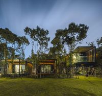 A peaceful residential area in Suzhou, China. Cabins and villas nestled among trees and bushes. Serene grass surface with wooden steps leading to each property. The night time photo showcases the beauty of artificial light illuminating the open space.