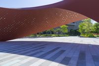 Futuristic red pavilion in Suzhou's urban park, surrounded by lush green trees. The modern architecture of the structure stands out against the clear sky. A vibrant city life under the shade of tints and shades.
