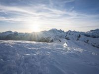 A breathtaking view of the snow-covered Alps in Switzerland during dawn. The clear sky reveals the majestic mountain range. Skiers enjoy the recreational activity on the glacial surface under the bright sunshine.