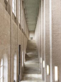 This photo showcases a stunning symmetrical interior design in Munich, Germany. The architecture of the building is truly remarkable, featuring straight down the road stairs, tiled flooring, and glass walls. The column-lined hall leads to a spacious room with a beautiful ceiling and a well-designed aisle. The overall symmetry of this interior design reflects a sense of elegance and sophistication. Perfect for architecture enthusiasts and those interested in interior design. Exploring Bayern's vibrant city of Munich is a must for anyone seeking to appreciate the art and beauty of architecture.