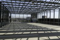 This image shows an urban construction site in Toronto, Canada. The photo captures an empty train station in the process of being built. The concrete surface and beams of the station demonstrate the engineering and urban design involved in the project. The clear sky above contrasts with the symmetrical lines and open spaces of the station. With vegetation and parking decks in the surrounding area, the image represents a typical day in Toronto's urban landscape. This photo showcases the intersection of modern infrastructure and natural elements in the city.