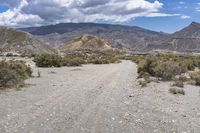 This image captures the rugged beauty of the Tabernas desert in Spain. The clear sky and bright sunlight illuminate the sandy landscape, with mountains in the distance. A dirt road cuts through the desert, surrounded by scant vegetation and shrubs. The road surface appears rough, with patches of gravel and bedrock. This off-road track provides a thrilling adventure for nature enthusiasts. The pristine beauty of this European highland is a must-see for any traveler. Experience the untouched beauty of Spain's Tabernas desert in this stunning photo.
