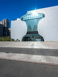 This image captures the modern architecture and urban design of a city in Taiwan. The white building with a glass front and a curved side stands out against the clear sky. The cityscape showcases the mix of old and new, with the city's roads and asphalt surface leading towards the building. This photo reflects the vibrant city life and showcases the urban landscape of Taiwan, specifically in Taichung or Taipei. The architecture and design of the building highlight the country's progressive and modern atmosphere.
