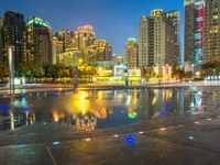 Nighttime cityscape in Taiwan, with modern architecture illuminated by artificial lights. Clear sky provides a reflection on the surface of the pond. Streets are empty, creating a serene atmosphere.