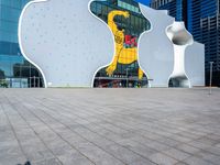 This image captures the vibrant city life in Taiwan, specifically in Taichung and Taipei. The young man on a skateboard adds a dynamic energy to the scene as he rides along a brick sidewalk. The glass building in the background showcases modern architecture, symbolizing the urban design of the city. The open spaces surrounding the building provide a contrast to the bustling streets, allowing for moments of relaxation. This photo represents the intersection of traditional and modern elements in Taiwan's cities.