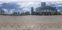 a city and the building seen through a fisheye lens lens while you can see the reflection