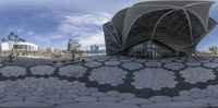 A futuristic architectural masterpiece in Kaohsuing, Taiwan. This modern structure stands tall against the clear sky, casting hard shadows on the geometric flowers arranged on its floor. A perfect blend of urban design and coastal beauty.