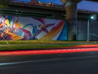 a very nice wall with some very cool artwork in it's background and the light from cars turning around it