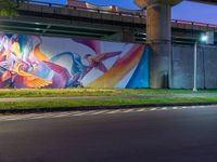 This photo captures a vibrant mural painted on a wall in Taipei, Taiwan. The mural stands in front of a highway overpass, adding a splash of color to the urban landscape of the city. The clear sky and street lights create a unique atmosphere during the night. The asphalt road and surrounding recreational park add to the overall aesthetic of the scene. This image represents the artistic and modern side of Taipei, merging street graffiti with the city's infrastructure.