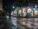 Aerial view of Taipei City at night, with rain-soaked streets illuminated by neon lights. The high position provides a top-down perspective of the city's urban design. A distorted image captures the essence of city life.