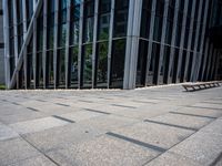 This image showcases the urban design and modern architecture of Taipei City, Taiwan. The futuristic glass walls of the buildings reflect the clear sky and create a sleek and contemporary look. The empty street is surrounded by long bars of glass and benches, with pebbles covering the ground. The open spaces and surface materials, such as asphalt and composite materials, contribute to the overall urban aesthetic. This photo represents the vibrant city life and innovative urban design of Taipei City.