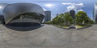 a fish - eye view of the building next to the tree lined plaza on a sunny day