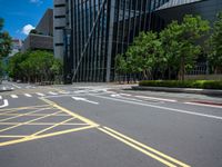 A modern road in Taipei City, Taiwan, lined with futuristic architecture. Clear skies highlight the urban design of the city. Vibrant vegetation and trees line the thoroughfare, creating a refreshing public space.