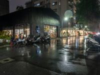 This image captures the vibrant city life in Taipei, Taiwan. The rainy street corner, illuminated by neon lights and streetlights, reflects the urban design and artificial lighting that characterize the city. The motorcycles parked next to each other add to the bustling atmosphere of the scene. This photo showcases the intersection of modern architecture and traditional elements in Taipei City. The wet asphalt and dark sky indicate the rainy night in the city. It is a perfect representation of Taipei's lively street culture.