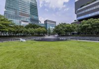A view of Taipei City's skyline featuring the iconic Taipei 101 skyscraper. The modern architecture blends seamlessly with lush green vegetation and open spaces. The bustling cityscape captures the vibrant energy of urban life in Taiwan.