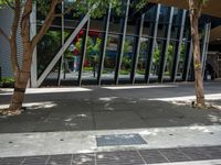 an empty street is lined with tall buildings and trees in front of the building is covered in mirrors