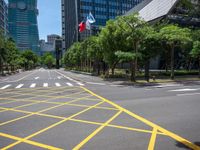 This is an image of a city street in Taipei, Taiwan. The futuristic architecture of the skyscrapers and modern buildings creates a stunning urban landscape. The straight road, lined with yellow lines, showcases the well-planned urban design of Taipei City. In the foreground, vegetation and trees add a touch of green to the urban environment. The flag flying at the top of one of the buildings represents the Republic of China. This photo captures the vibrant city life of Taipei, with its modern architecture and open spaces.