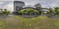 a 360 - 360 view of the city from a grassy area near the sidewalk and the sidewalk, a green lawn, and tall buildings