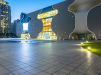 A modern architectural marvel in Taiwan's cityscapes. This structure, located in Taichung or Taipei, stands tall against the clear sky. The surface of the structure shines during dawn or in the evening, creating a stunning sight.